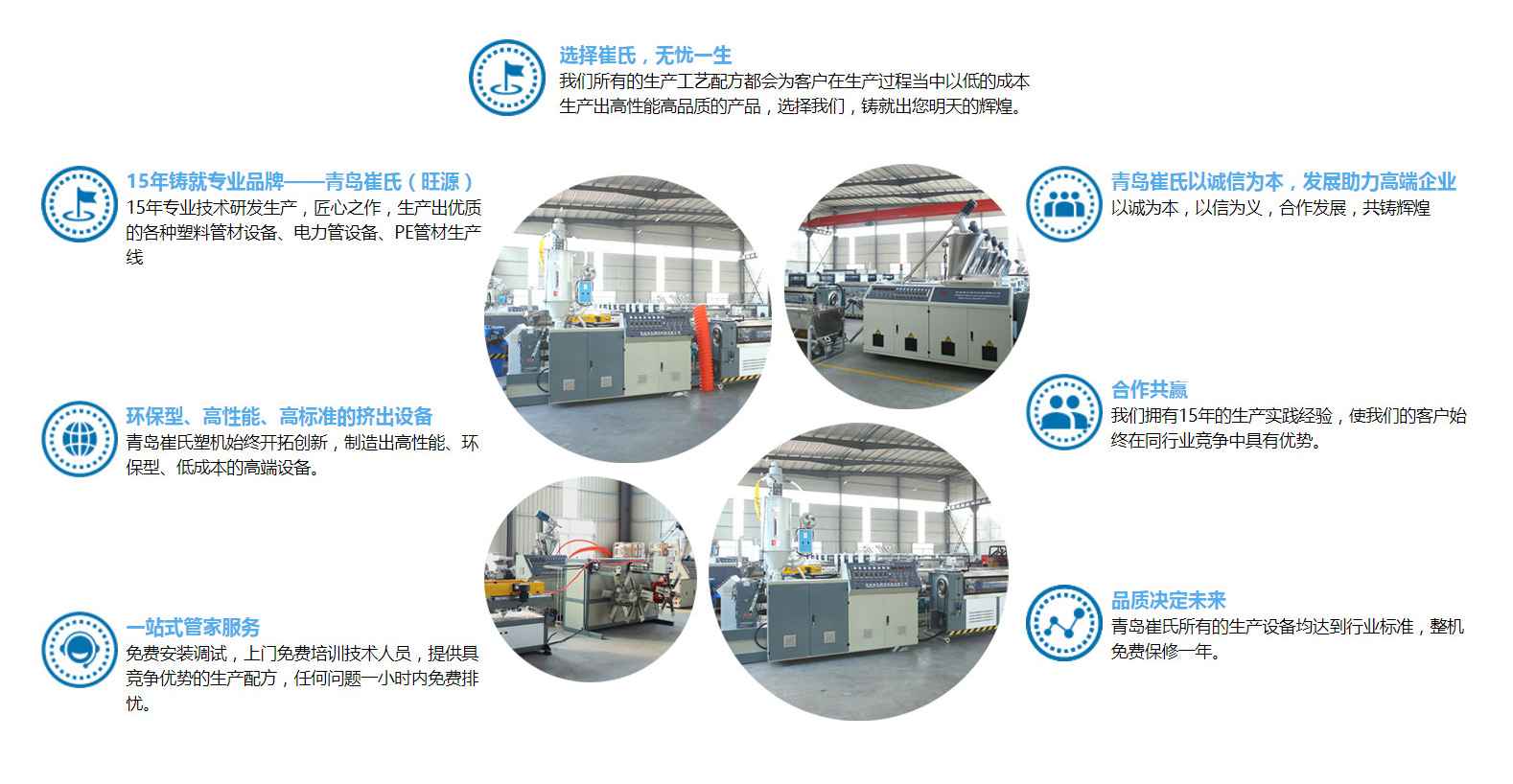 青島崔氏塑料機(jī)械:生產(chǎn)的預(yù)應(yīng)力塑料波紋管設(shè)備、電力管設(shè)備、塑料波紋管設(shè)備、汽車線束波紋管設(shè)備、PPR、PE、PVC、PERT管材設(shè)備及其它各種管材設(shè)備、塑料型材設(shè)備、塑料蜂窩板設(shè)備, 遠(yuǎn)銷:歐州,獨(dú)聯(lián)體,南美洲,中東,東南亞,大洋州,非洲等地的20多個(gè)國家和地區(qū)。